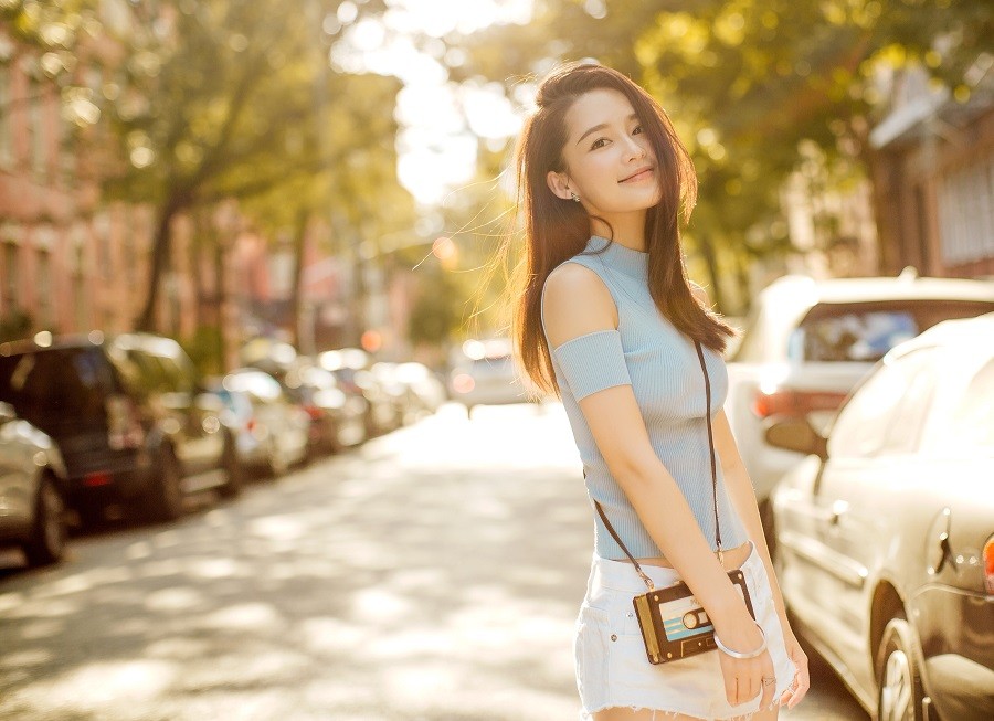 李沁春日漫步笑靥如花 雾霾蓝穿搭点亮街头