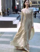 刘诗诗身着丝绸质地的长裙侧身而立,柔和的光线为她镀上一层金色轮廓,发丝随风轻扬,眼神宁静望向远方刘诗诗于古典建筑门前驻足回眸,长裙裙摆如波浪般铺洒开,她手扶门廊,姿态典雅仿佛从旧时光中走来的名媛刘诗诗行走在纽约林荫道上,阳光透过树叶在她身上投下斑驳光影,她嘴角含笑,步履轻盈,仿佛整个秋日的温柔都凝聚于此刘诗诗倚靠在现代风格的墙边,长裙的褶皱形成优雅纹理,她微微低头沉思,静谧的画面充满故事感和电影质感
